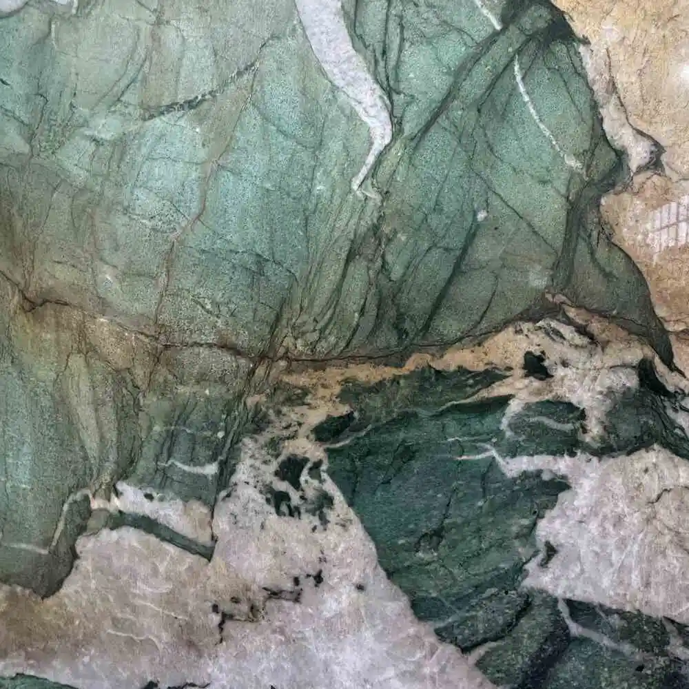 Quartzite offers a wide range of colors and patterns, often resembling marble with its veining and subtle color shifts but with the added durability that marble lacks. It is available in hues ranging from white, gray, and beige to pink, green, and blue tones, often featuring striking veining that can add depth and visual interest.